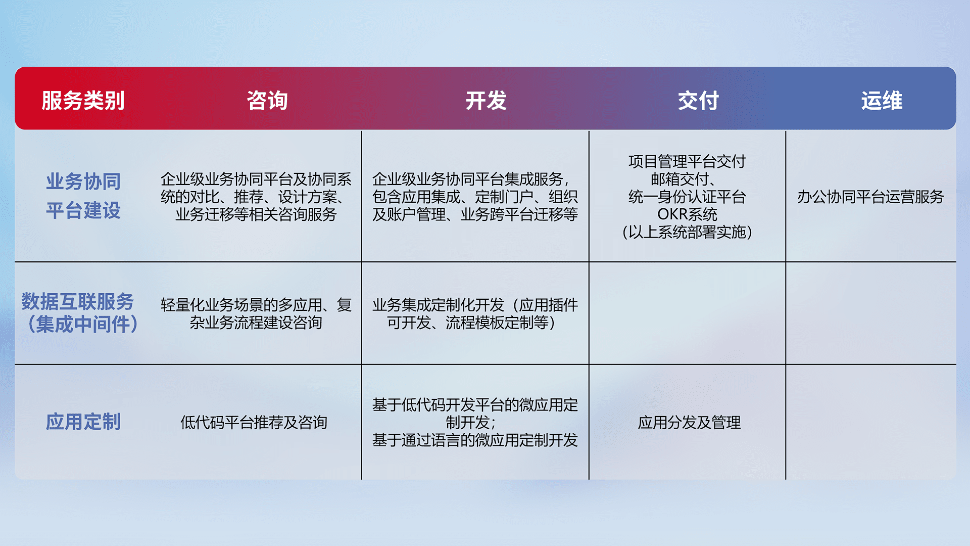 针对钉钉、、、、企微、、、、IDaas等平台级产品提供产品的规划、、、方案、、、、交付、、定制化开发等服务,,,,实现如统一协同办公、、智能客户服务、、、混合会议管理、、、智能数据查询、、等业务场景,,,实现数字化转型。。。。
