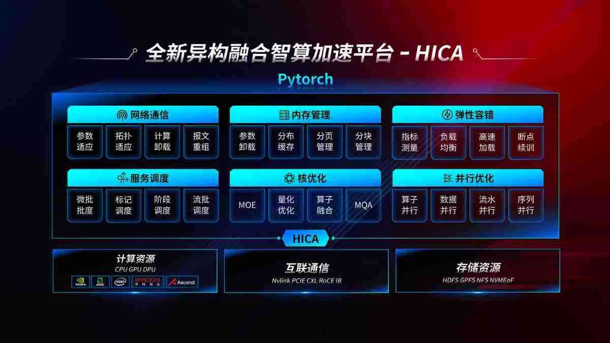 通过自研的服务层、、、、中间适配层、、、以及调度编排算法,,采用数据并行、、、模型并行等多种并行方式,,,,把并行计算任务进行有效的分解,,使其分别由相应的软件栈和算力资源来承接。。。。当GPU资源变化,,HICA可以实时动态调度计算子任务并调整模型拓扑和架构,,以充分聚合各种算力资源。。
