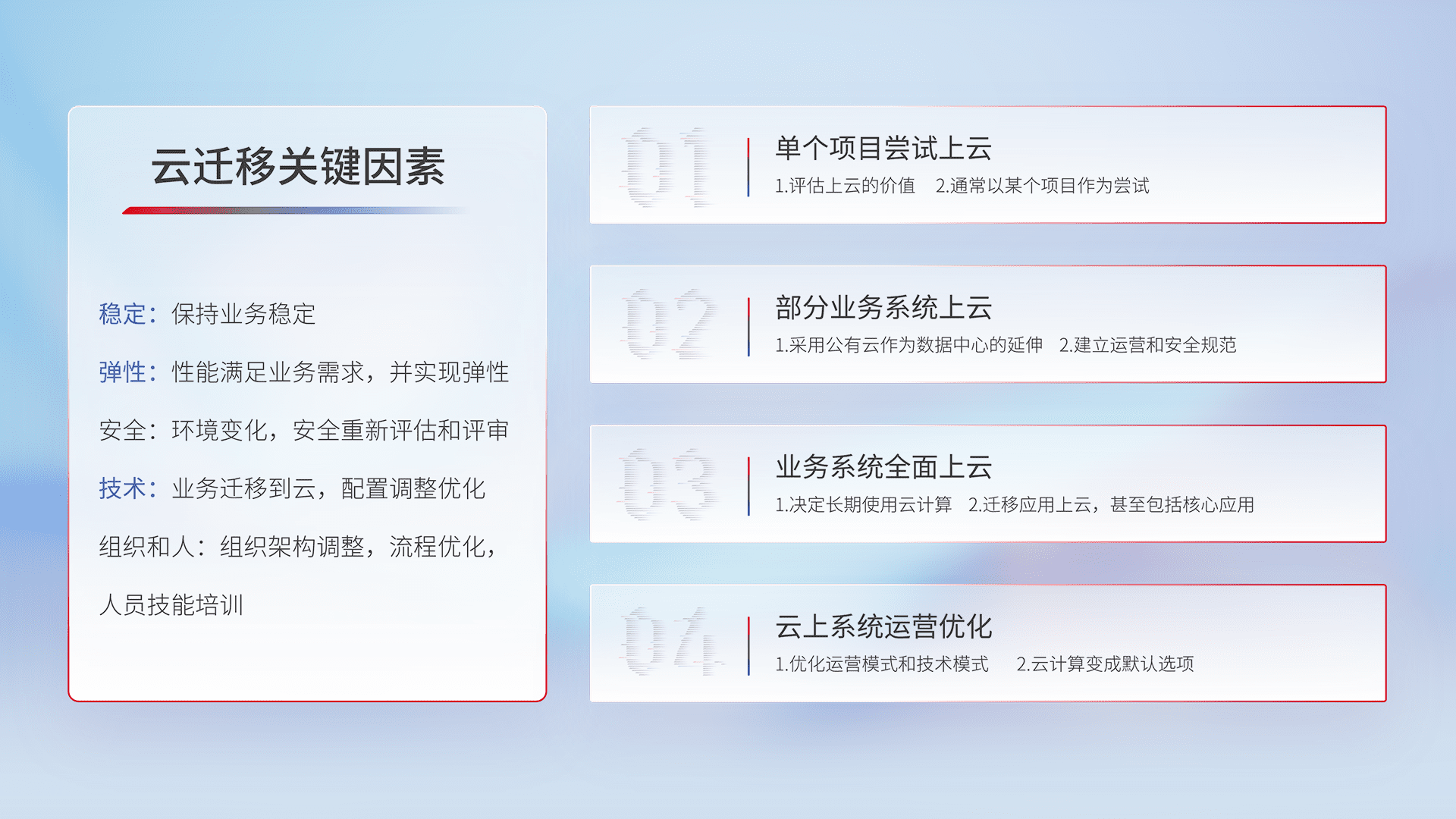 结合实际业务,,,,从规划设计、、、、云平台选型、、、云原生改造、、、数据迁移、、集成交付,,迁移全过程为客户识别最佳上云路径,,,,做好风险识别管理,,设计网络架构、、、身份权限、、、、安全审计合规、、操作审计、、、日志审计、、、、监控告警策略、、、多站点容灾设计等,,对云上基础设施进行整体规划,,提升IT治理水平,,,,以满足弹性、、高可用、、高性能的需求。。。。