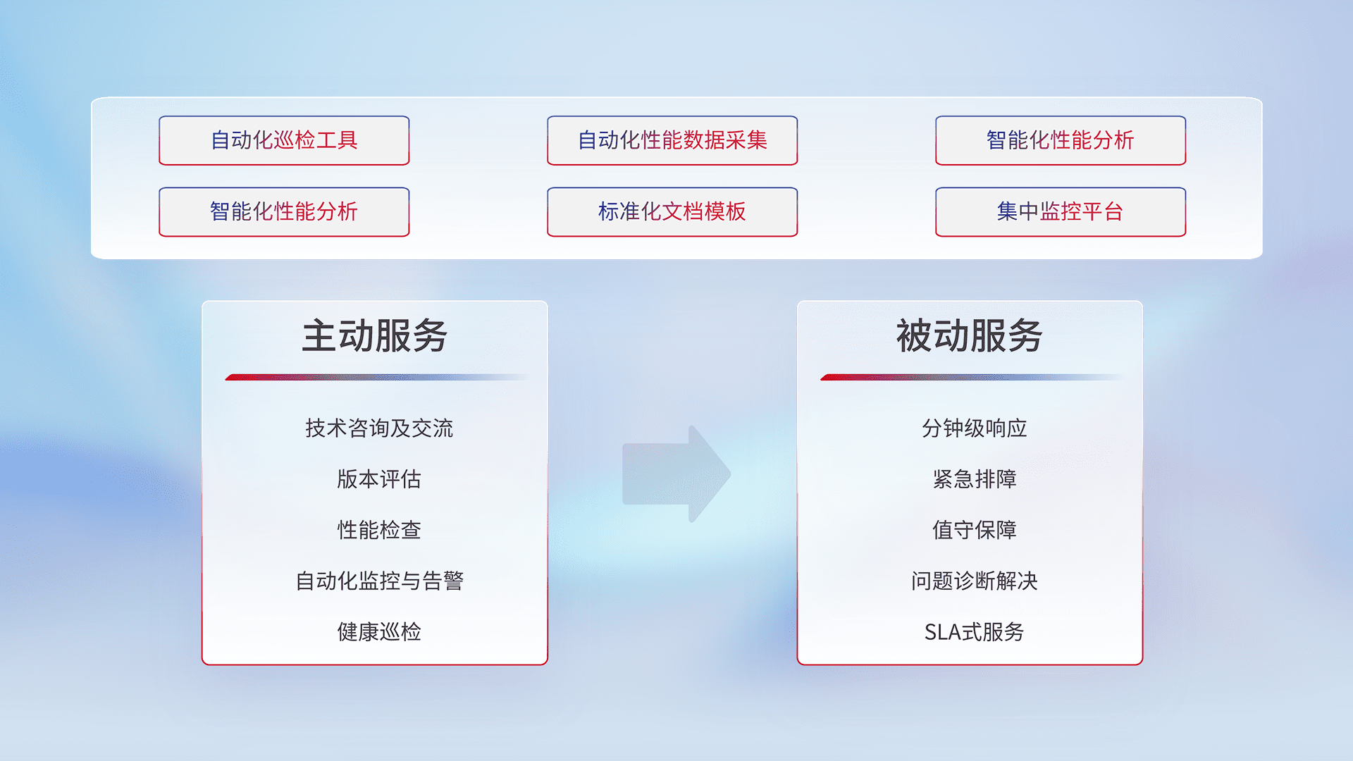 智能化工具和标准化文档,,保障服务质量,,,,提供主动服务(包含技术咨询、、版本评估、、性能检查、、自动化监控与告警、、、健康巡检)和被动服务包含(分钟级响应、、、紧急排障、、、值守保障、、问题诊断解决、、、SLA服务)。。